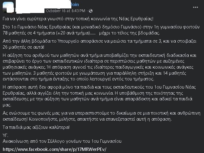 Πρόκειται για μία κίνηση που αναφέρουν ότι θα επηρεάσει σοβαρά το μάθημα, καθώς οι καθηγητές θα πρέπει να τα βγάλουν πέρα με πολλούς περισσότερους μαθητές, κάτι που θα υποβαθμίσει την ποιότητα της εκπαίδευσης αφού θα έχει μεγαλύτερο όγκο δουλειάς ο δάσκαλος. Ταυτόχρονα, τονίζουν πως παιδιά με μαθητικές δυσκολίες θα αντιμετωπίσουν κι αυτά προβλήματα, αφού δεν θα υπάρχει χρόνος για τον κάθε δάσκαλο να δώσει περισσότερο βάρος σε παιδιά που χρειάζονται επιπλέον βοήθεια.