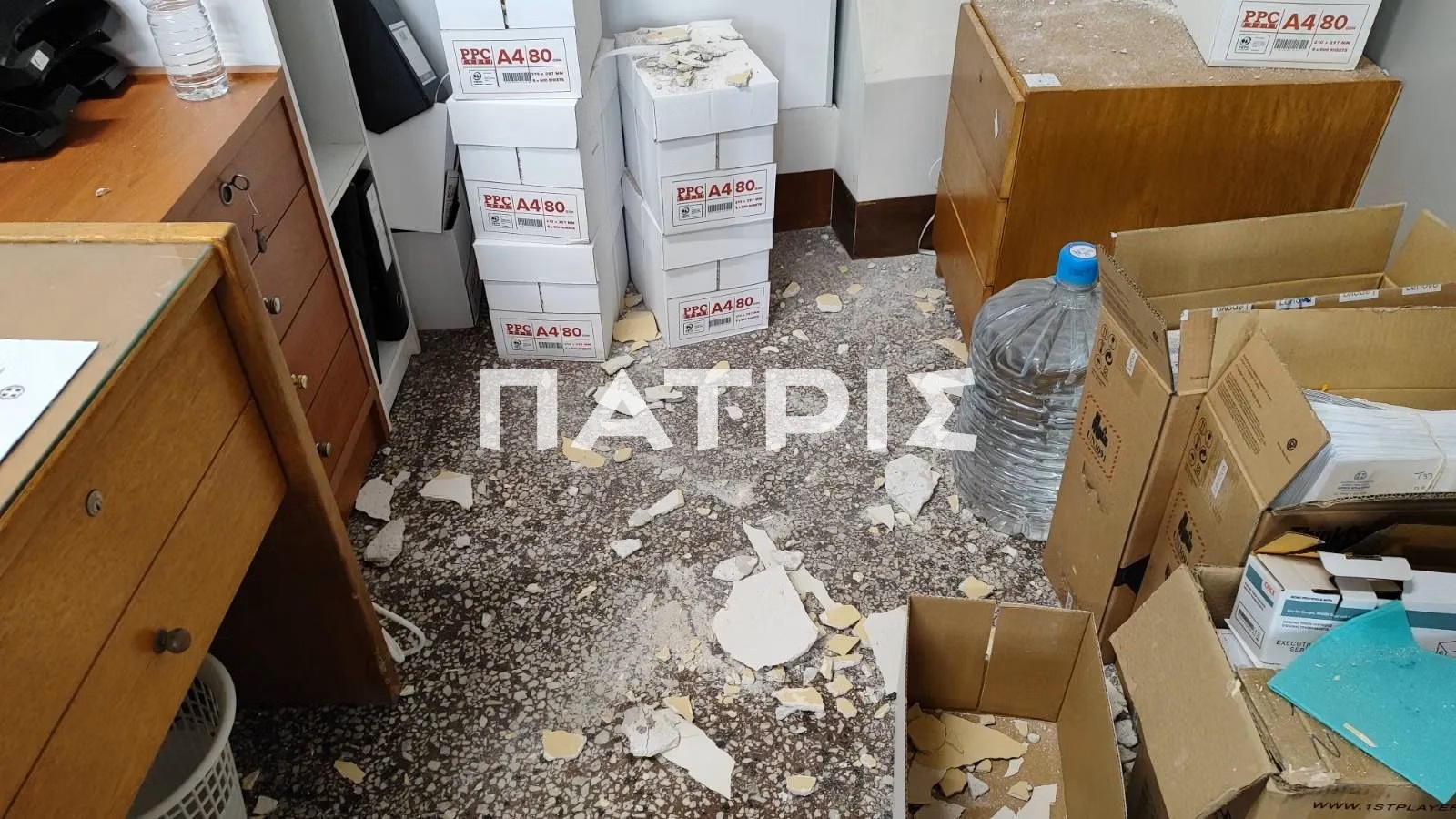 Σύμφωνα με πληροφορίες του patris.gr, στο γραφείο Ταμειακής Βεβαίωσης στη Λότζια έπεσαν ξαφνικά κομμάτια από σοβά στο πάτωμα μπροστά στα έκπληκτα μάτια εργαζομένων και πολιτών.