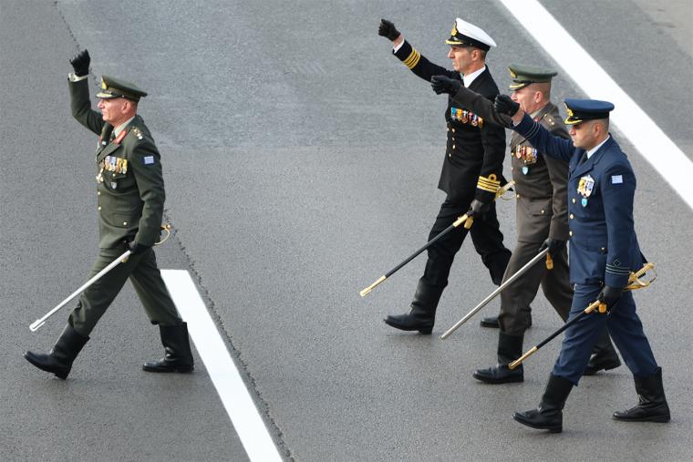 Άρματα μάχης και οχήματα του Ελληνικού Στρατού, περιπολικά και μοτοσικλέτες της Ελληνικής Αστυνομίας καθώς και υδροφόρα οχήματα της Πυροσβεστικής, πήραν από νωρίς θέση και πραγματοποίησαν διελεύσεις σε άψογο σχηματισμό