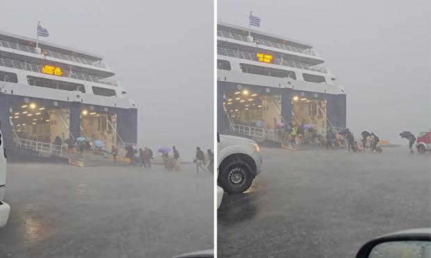 Σε βίντεο που καταγράφηκε στο λιμάνι του νησιού φαίνεται καθαρά η ένταση του φαινομένου: ένα οχηματαγωγό πλοίο έχει δέσει στον προβλήτα, αλλά η συνεχής και δυνατή βροχή καθιστά τη διαδικασία επιβίβασης και αποβίβασης ιδιαίτερα δύσκολη.