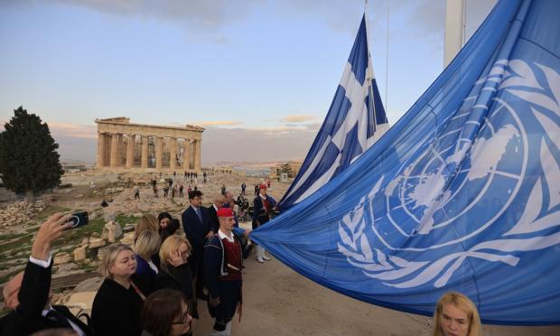 Τελετή για τα 80 χρόνια από την ίδρυση του Οργανισμού των Ηνωμένων Εθνών, πραγματοποιήθηκε το πρωί της Παρασκευής στον ιερό βράχο της Ακρόπολης. Στη διάρκειά της, έγινε έπαρση της σημαίας του ΟΗΕ μαζί με την ελληνική.