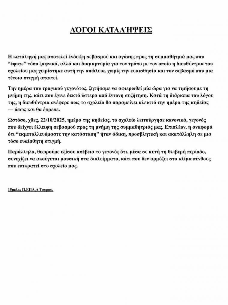Ωστόσο, στις 22/10/2025, ημέρα της κηδείας, το σχολείο λειτούργησε κανονικά, γεγονός που δείχνει έλλειψη σεβασμού προς τη μνήμη της συμμαθήτριάς μας.