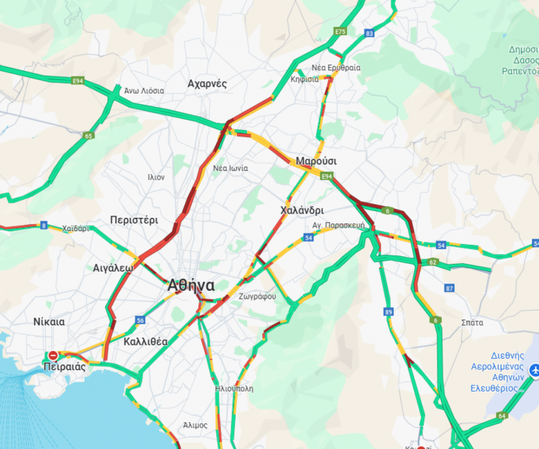 Την ίδια ώρα πολύ αυξημένη είναι η κίνηση στον Κηφισό και στο ρεύμα προς Πειραιά. Ειδικότερα τα προβλήματα στην κυκλοφορία παρατηρούνται από το ύψος της Λυκόβρυσης έως και το ύψος του Αιγάλεω.