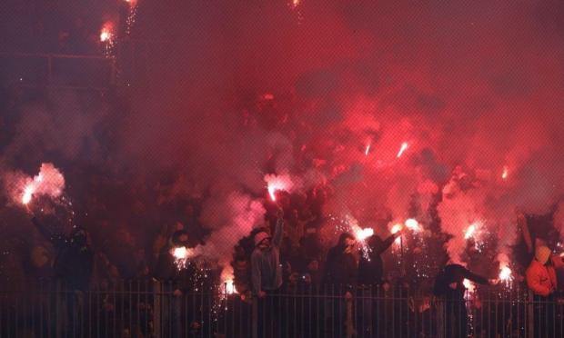 Ειδικότερα, ο 49χρονος εντοπίστηκε κατά τη διάρκεια του ποδοσφαιρικού αγώνα, μέσω του κλειστού κυκλώματος ασφαλείας του γηπέδου, να παραδίδει στον ανήλικο γιο του, ηλικίας κάτω των 12 ετών, δύο φωτοβολίδες χειρός, τις οποίες άναψε ο ανήλικος.