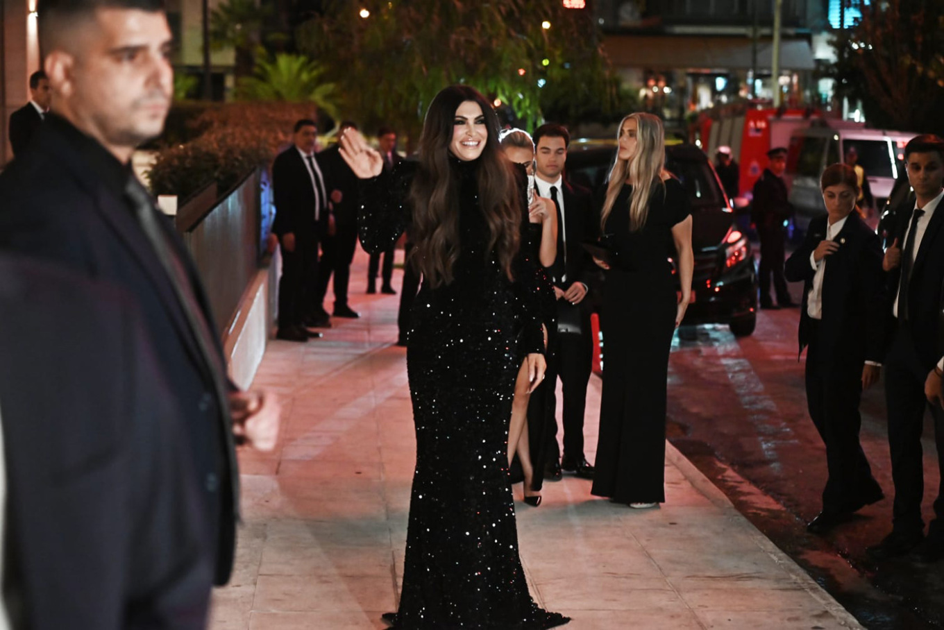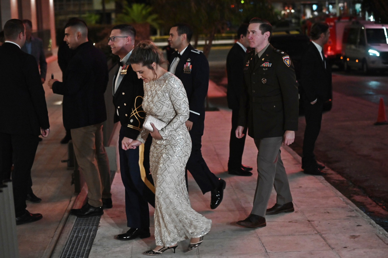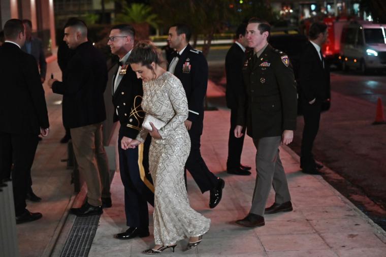 Στις πρώτες εν Αθήναις φωτογραφίες της, η Αμερικανίδα πρέσβης εμφανίστηκε λαμπερή και χαμογελαστή μπροστά στα φλας των φωτογράφων, φορώντας ένα μακρύ μαύρο φόρεμα με στρας και χαιρετώντας τον κόσμο που είχε συγκεντρωθεί από το ξενοδοχείο στη λεωφόρο Συγγρού.