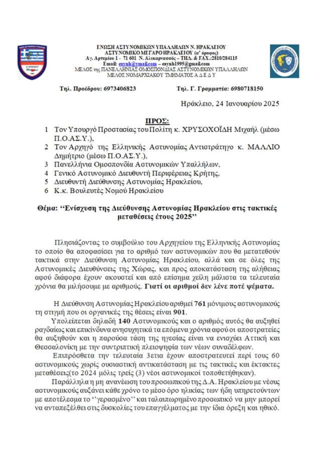 Η Ένωση Αστυνομικών Υπαλλήλων Νομού Ηρακλείου προειδοποιεί ότι η αδιαφορία οδηγεί σε τραγωδίες – Ζητά άμεση ενίσχυση δυνάμεων στη Μεσαρά και στο Ηράκλειο