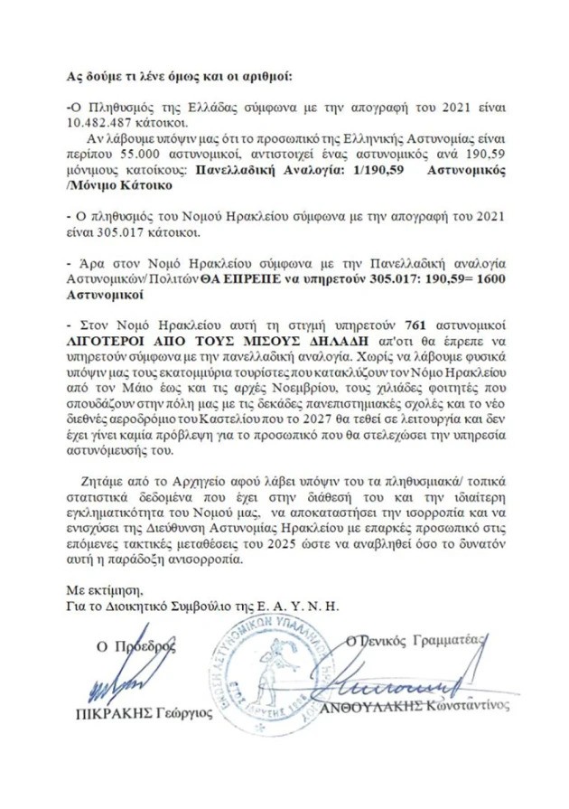 Ο πληθυσμός του Ν. Ηρακλείου είναι 305.017 κάτοικοι. Θα έπρεπε να υπηρετούν τουλάχιστον 1.600 αστυνομικοί, ενώ σήμερα υπηρετούν μόλις 761.