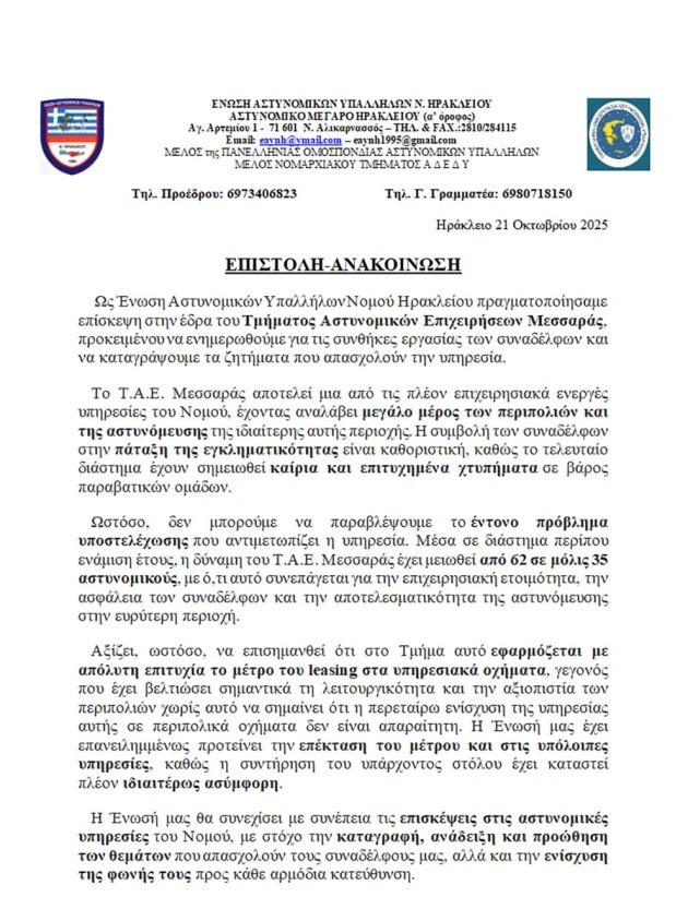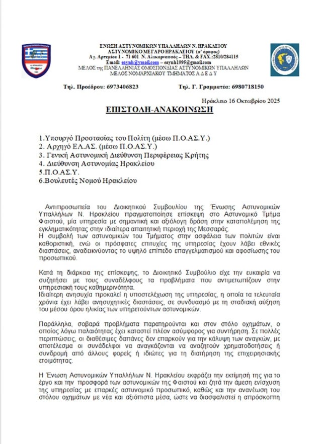 Αν πούμε ξανά ότι «εμείς τα λέγαμε», ίσως καταντήσουμε γραφικοί. Με τις από 16 και 21 Οκτωβρίου 2025 επιστολές μας προς την Πολιτική και Φυσική Ηγεσία, μετά την επίσκεψη του Προεδρείου μας στην περιοχή της Μεσσαράς, είχαμε επισημάνει την έντονη και επικίνδυνη υποστελέχωση του Α.Τ. Φαιστού και του Τ.Α.Ε. Μεσσαράς, υπηρεσιών που σηκώνουν στις πλάτες τους την αστυνόμευση μιας περιοχής με αυξημένη επικινδυνότητα και πολυσύνθετη εγκληματικότητα.