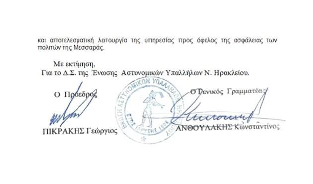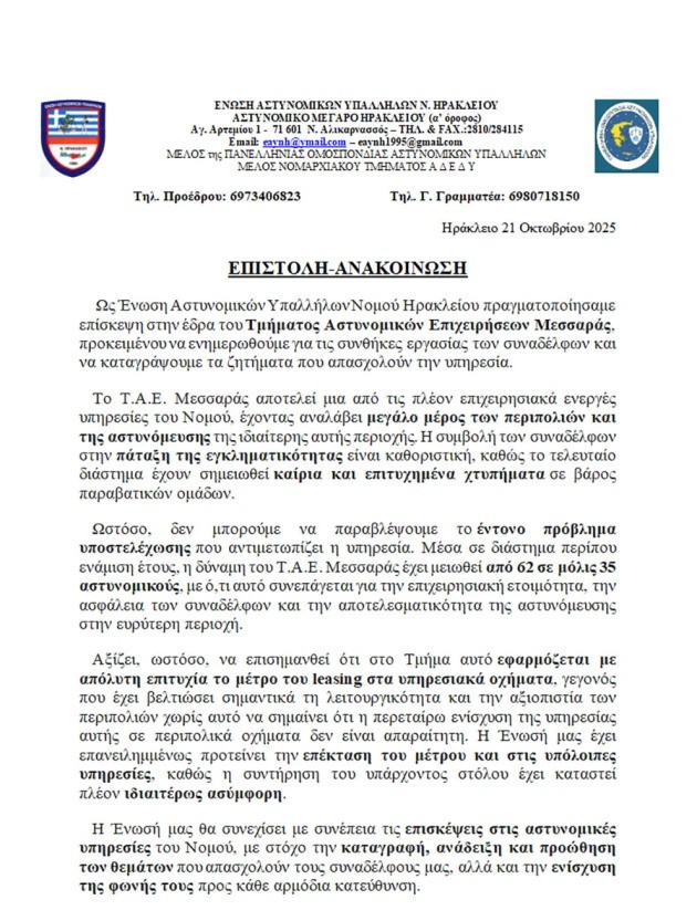Σε αυστηρό τόνο, η Ένωση Αστυνομικών Υπαλλήλων Νομού Ηρακλείου καταγγέλλει την επικίνδυνη και χρόνια υποστελέχωση των υπηρεσιών του νομού, και ιδιαίτερα της Μεσαράς, σημειώνοντας ότι οι επανειλημμένες προειδοποιήσεις της αγνοήθηκαν από την Πολιτεία, με αποτέλεσμα να φτάσουμε σε τραγικά γεγονότα.