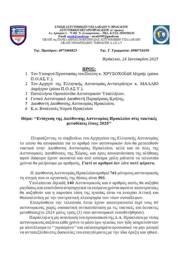Καλούμε τους Βουλευτές Ηρακλείου και τους τοπικούς φορείς να σταθούν στο ύψος των περιστάσεων. Η ασφάλεια των πολιτών και η αξιοπρέπεια των αστυνομικών δεν διαπραγματεύεται.
