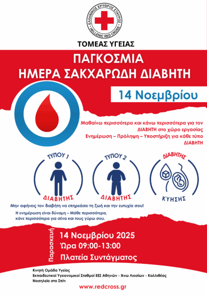Ο Ελληνικός Ερυθρός Σταυρός (ΕΕΣ), με αφορμή την Παγκόσμια Ημέρα Διαβήτη, που εορτάζεται κάθε χρόνο στις 14 Νοεμβρίου, συμμετέχει ενεργά στην παγκόσμια εκστρατεία ενημέρωσης και ευαισθητοποίησης με θέμα για το 2025: «Ο Διαβήτης και ο Χώρος Εργασίας – Μάθετε περισσότερα και κάντε περισσότερα για τον Διαβήτη στην εργασία». Στο πλαίσιο αυτό, ο Ελληνικός Ερυθρός Σταυρός διοργανώνει ανοιχτή προς το κοινό δράση προαγωγής υγείας, την Παρασκευή 14 Νοεμβρίου 2025, από 09:00 έως 13:00, στην Πλατεία Συντάγματος.