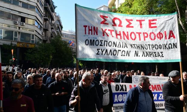 Με πανό «σώστε την κτηνοτροφία» οι αγρότες έξω από το υπουργείο Αγροτικής Ανάπτυξης
