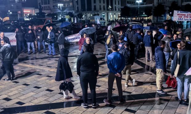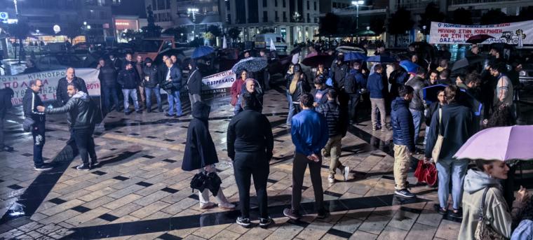 Η πλατεία γέμισε από αγροτικά, ενώ οι συγκεντρωμένοι κρατούσαν πανό στα χέρια τους, μαζί με ομπρέλες λόγω της βροχόπτωσης.