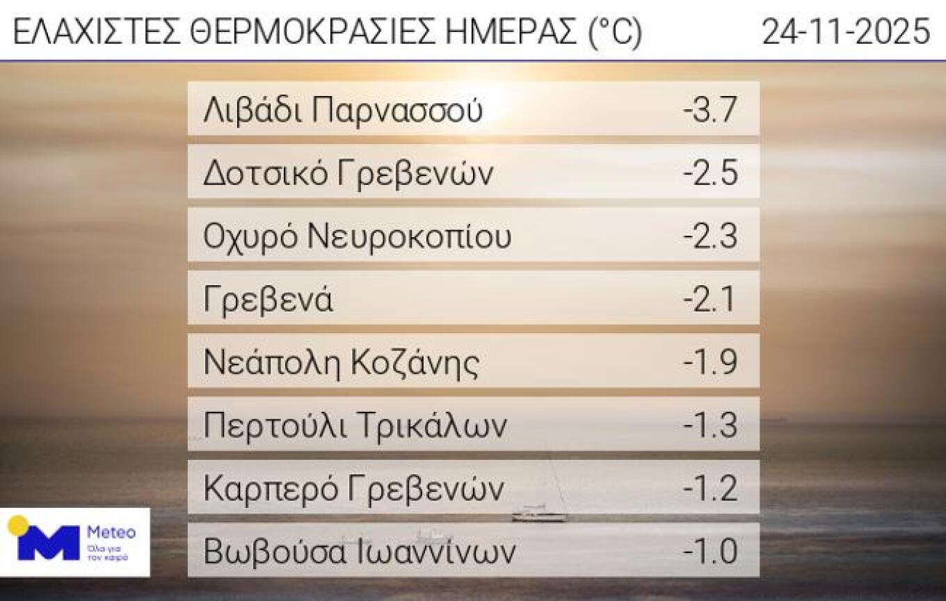 Χαμηλές ελάχιστες θερμοκρασίες σημειώθηκαν τις πρωινές ώρες της Δευτέρας 24/11 στα ηπειρωτικά τμήματα, με τη χαμηλότερη ελάχιστη θερμοκρασία να καταγράφεται στο Λιβάδι Παρνασσού με -3,7 °C. Σύμφωνα με το δίκτυο αυτόματων μετεωρολογικών σταθμών του Εθνικού Αστεροσκοπείου Αθηνών / meteo.gr οι οκτώ χαμηλότερες ελάχιστες θερμοκρασίες τις πρωινές ώρες της Δευτέρας 24/11, παρουσιάζονται στον παρακάτω πίνακα.