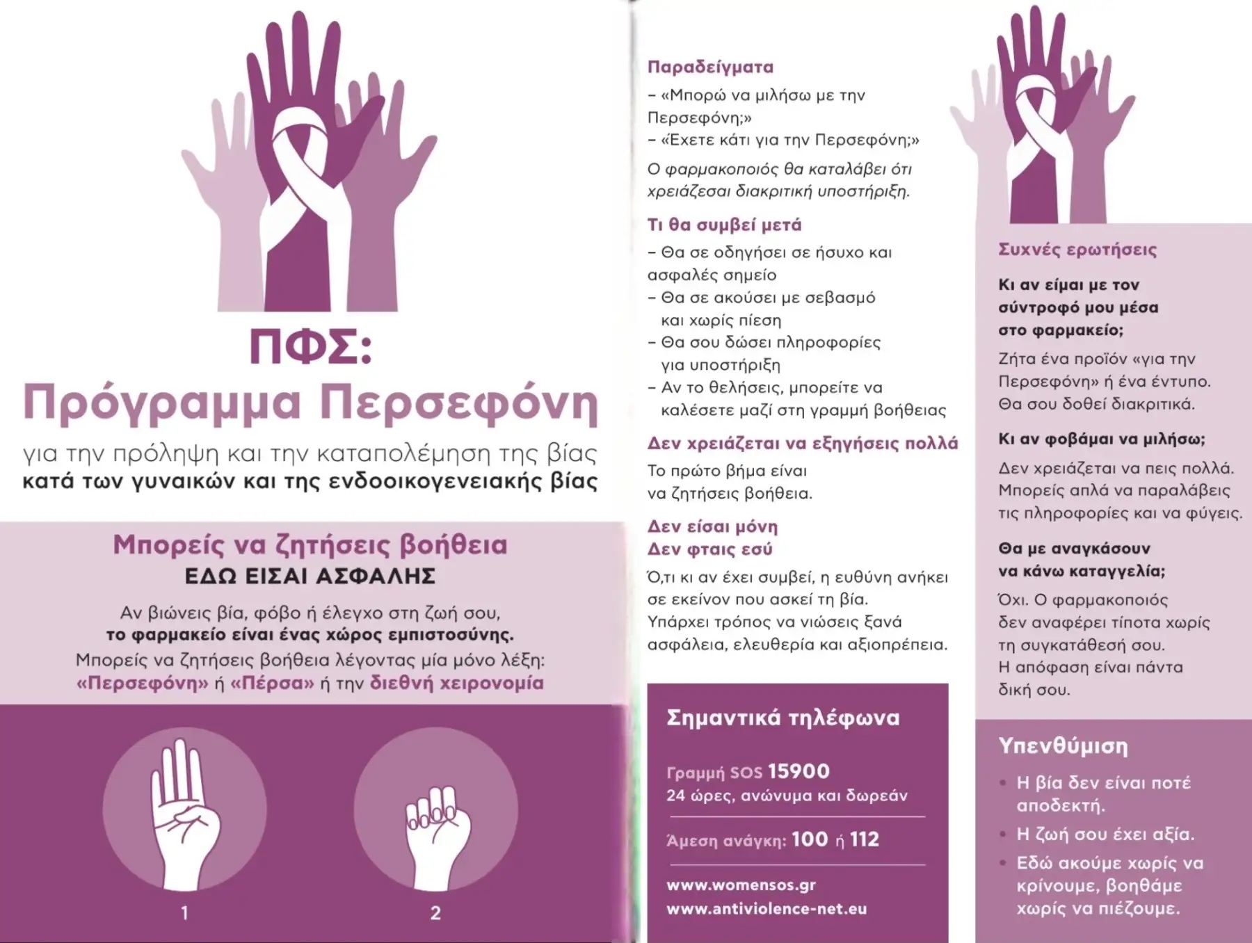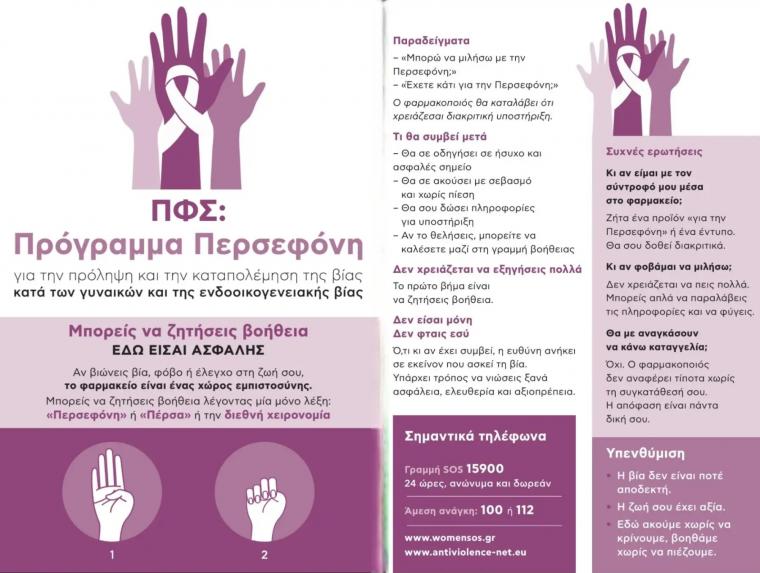 «Ο Πανελλήνιος Φαρμακευτικός Σύλλογος, με αίσθημα ευθύνης και απόλυτης ευαισθητοποίησης, καταγγέλλει κάθε μορφή βίας, σωματικής και ψυχικής κακοποίησης, και προσβολής της ανθρώπινης ζωής. Υποστηρίζει την ενεργή συμμετοχή των φαρμακείων της κοινότητας στην πρόληψη και την εξάλειψη της βίας μέσα από το πρόγραμμα με το όνομα «Περσεφόνη», και διαθέτει ηλεκτρονικό φυλλάδιο οδηγιών στα μέλη του προς χρήση του σε έντυπη μορφή στους πάγκους των φαρμακείων. Στόχος του φυλλαδίου και του προγράμματος με τον κωδικό ‘Περσεφόνη’, είναι η αφύπνιση των γυναικών θυμάτων, η έμπρακτη υποστήριξή τους και η προάσπιση της σωματικής τους ασφαλείας», τονίζει ο ΠΦΣ.