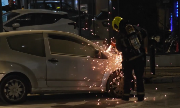 Οι πυροσβέστες άνοιξαν το καπό με τροχό και αφαίρεσαν τη μπαταρία για να αποτραπεί τυχόν έκρηξη. Η κίνηση στο σημείο είναι αυξημένη.