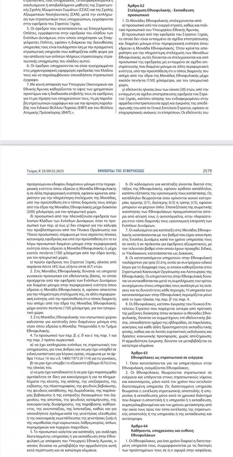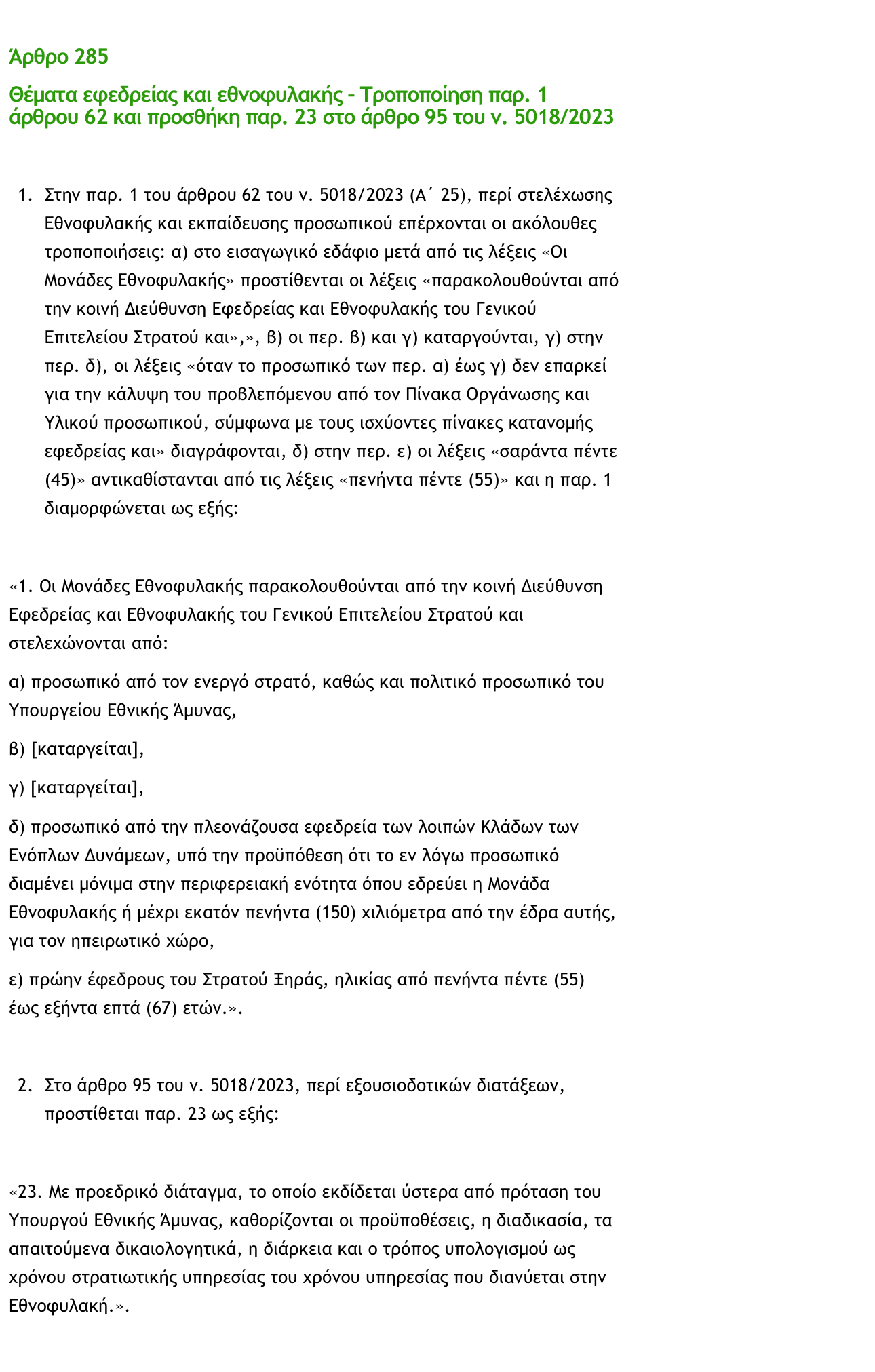 «1. Στην παρ. 1 του άρθρου 62 του ν. 5018/2023 (Α΄ 25), περί στελέχωσης Εθνοφυλακής και εκπαίδευσης προσωπικού επέρχονται οι ακόλουθες τροποποιήσεις: α) στο εισαγωγικό εδάφιο μετά από τις λέξεις “Οι Μονάδες Εθνοφυλακής” προστίθενται οι λέξεις «παρακολουθούνται από την κοινή Διεύθυνση Εφεδρείας και Εθνοφυλακής του Γενικού Επιτελείου Στρατού και”,”, β) οι περ. β) και γ) καταργούνται, γ) στην περ. δ), οι λέξεις “όταν το προσωπικό των περ. α) έως γ) δεν επαρκεί για την κάλυψη του προβλεπόμενου από τον Πίνακα Οργάνωσης και Υλικού προσωπικού, σύμφωνα με τους ισχύοντες πίνακες κατανομής εφεδρείας και» διαγράφονται, δ) στην περ. ε) οι λέξεις “σαράντα πέντε (45)” αντικαθίστανται από τις λέξεις “πενήντα πέντε (55)” και η παρ. 1 διαμορφώνεται ως εξής: