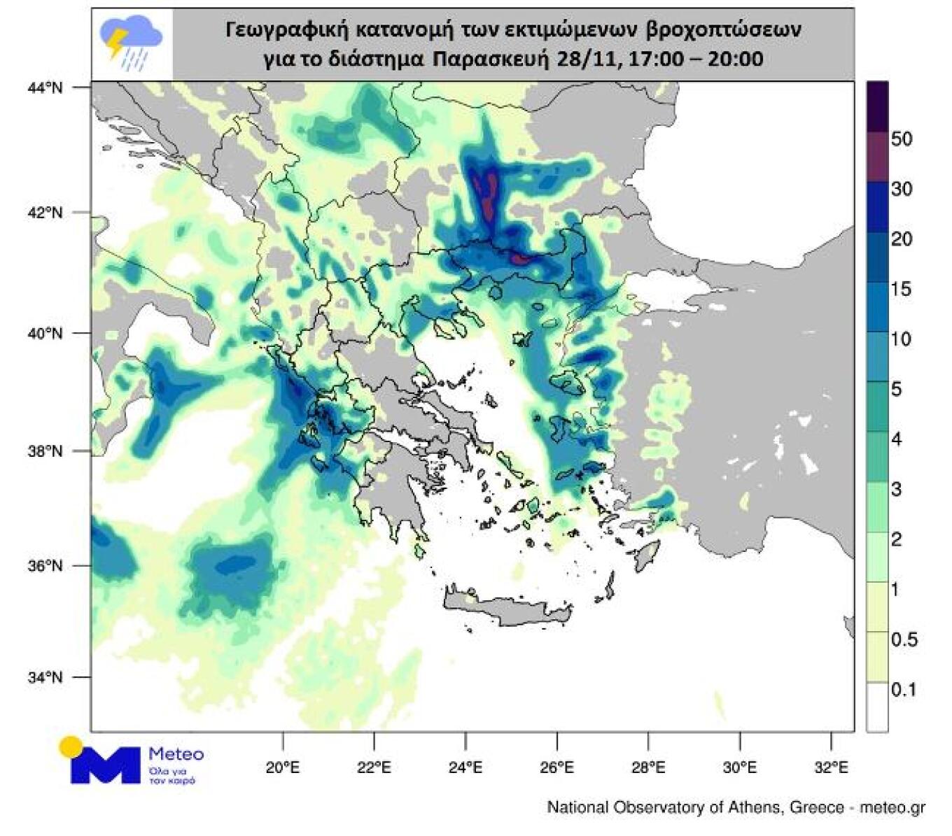 Σύμφωνα με το meteo.gr, την Πέμπτη το ύψος βροχής: