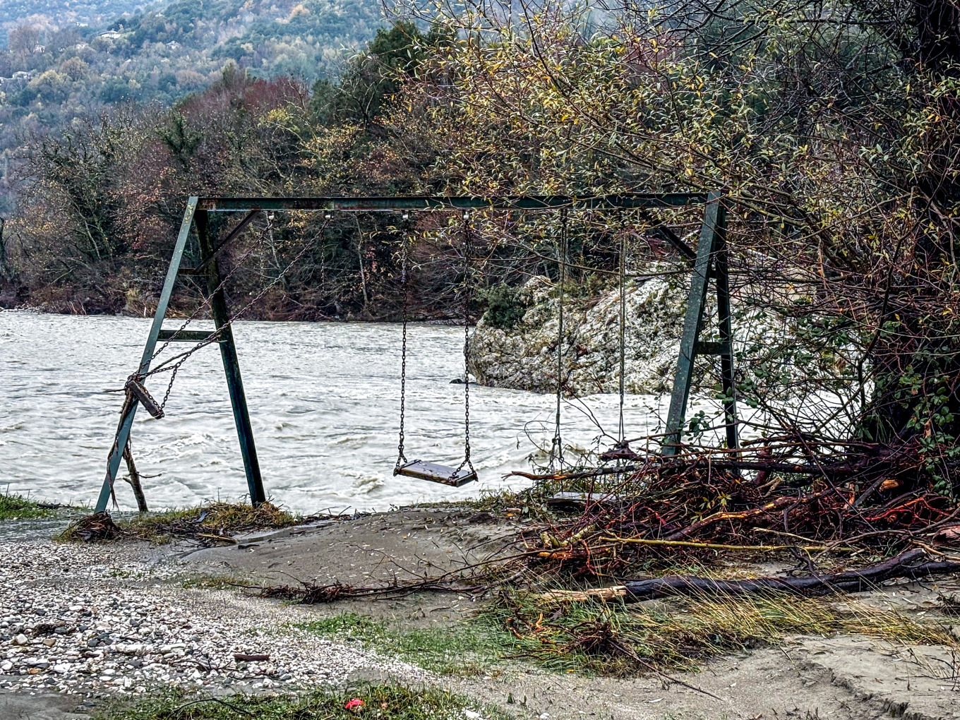 Όπως φαίνεται και στις φωτογραφίες, λόγω των ισχυρών βροχοπτώσεων υπερχείλισαν τα ποτάμια και τα ορμητικά νερά παρέσυραν παιχνίδια από παιδική χαρά, καθώς και δέντρα που βρίσκονταν κοντά στις όχθες.