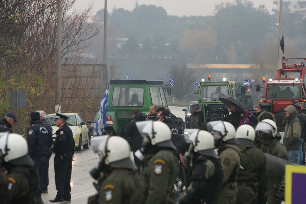 Αγρότες που διαδηλώνουν στον Λευκώνα Σερρών πέρασαν το μπλόκο των αστυνομικών και κατευθύνονται στο τελωνείο του Προμαχώνα.