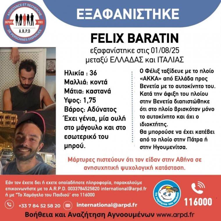 Ο Φέλιξ Μπαρατίν, 36 ετών, γαλλικής καταγωγής, επιβιβάστηκε σε πλοίο της γραμμής Πάτρα – Βενετία, με το όχημά του κι έκτοτε αγνοείται.