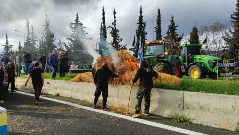 Σύμφωνα με τα όσα μετέδωσε το Mega, οι αγρότες άπλωσαν συμβολικά μπάλες με άχυρα και στη συνέχεια έβαλαν σε αυτές φωτιά.