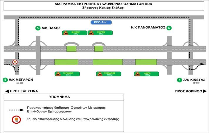 Τα οχηματα το παραπάνω χρονικό διάστημα θα εξυπηρετούνται μέσω της Παλαιάς Εθνικής Οδού μεταξύ των κόμβων Μεγάρων και Κινέτας, όπως φαίνεται στο ακόλουθο σχηματικό διάγραμμα: