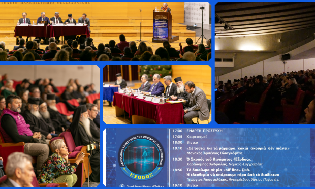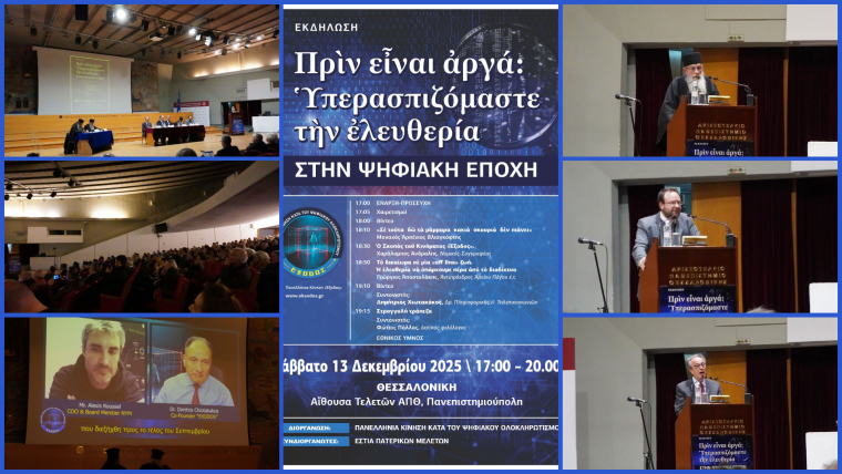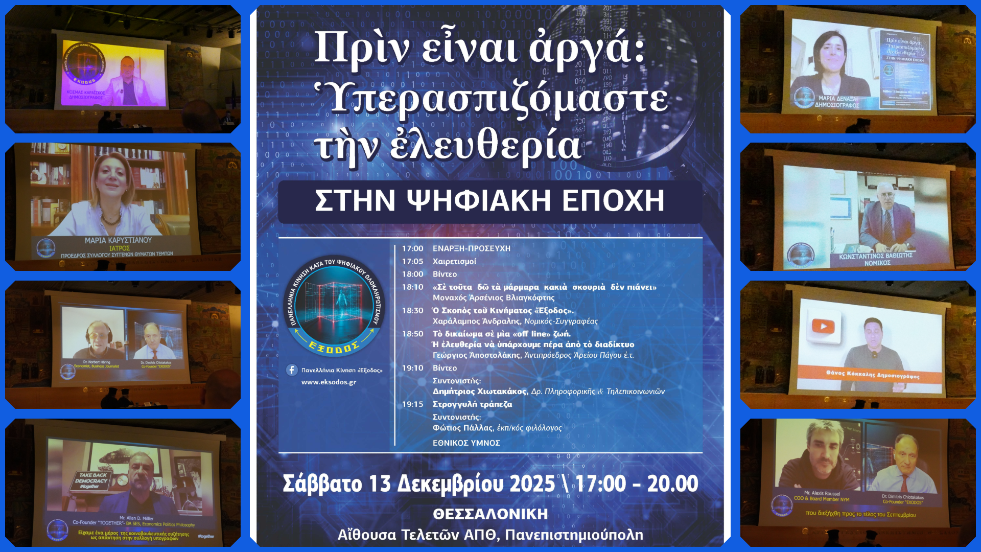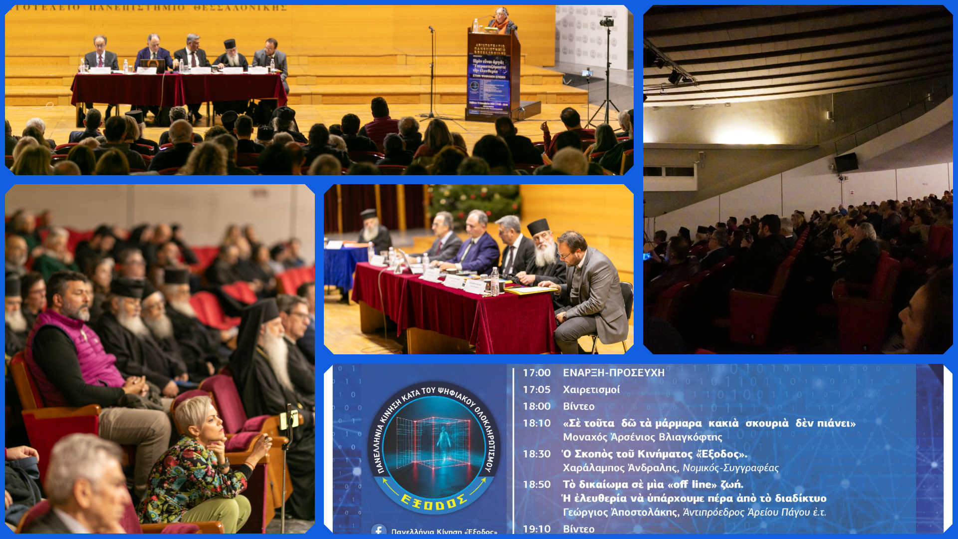 Με μεγάλη επιτυχία πραγματοποιήθηκε το Σάββατο 13 Δεκεμβρίου στην αίθουσα εκδηλώσεων του ΑΠΘ, η εκδήλωση του Πανελληνίου Κινήματος «ΕΞΟΔΟΣ» κατά του Ψηφιακού Ολοκληρωτισμού. Με συμμετοχή πλήθους κόσμου που γέμισε την αίθουσα, οι εισηγητές παρουσίασαν με τεκμηριωμένο λόγο τους πνευματικούς και κοινωνικούς κινδύνους που κρύβονται πίσω από τον καθολικό ψηφιακό μετασχηματισμό του Κράτους, εναντίον του οποίου η ΕΞΟΔΟΣ συλλέγει υπογραφές