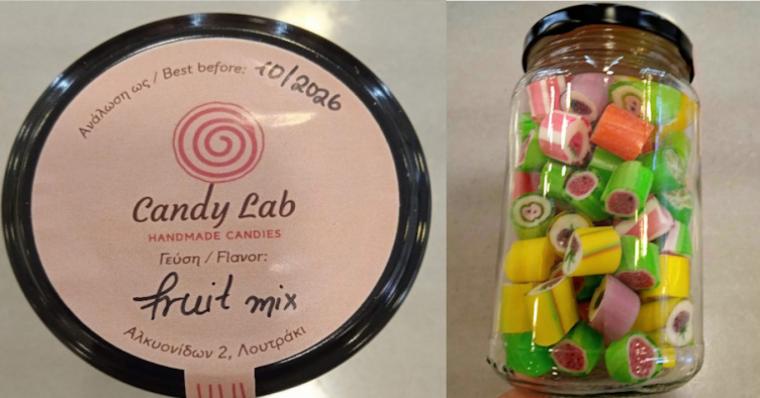 - Καραμέλες «fruit mix» με ημερομηνία ανάλωσης ως 10/2026, συσκευασίας καθαρού βάρους περίπου 230 γρ., το οποίο παράγεται και συσκευάζεται στην Ελλάδα από την «Candy Lab» που εδρεύει στο Λουτράκι Κορινθίας.