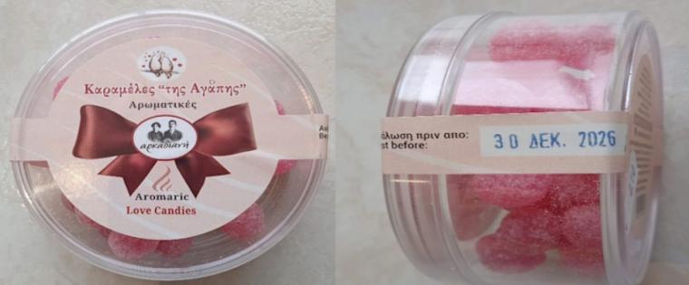 - Καραμέλες «της Αγάπης-Αρωματικές» με ημερομηνία ανάλωσης πριν από τις 30 Δεκ. 2026, συσκευασίας καθαρού βάρους περίπου 110 γρ. της εταιρείας με διακριτικό τίτλο «αρκαδιανή» που εδρεύει στο Ψάρι Αρκαδίας.