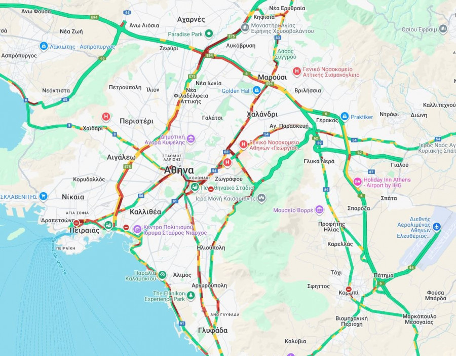 Κίνηση καταγράφεται και στην Αττική Οδό αφού οι καθυστερήσεις προς Ελευσίνα είναι 5'-10' από Πλακεντίας έως Κηφισίας, 10'-15' στην έξοδο για Πειραιά.