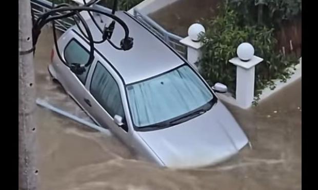 Σε βίντεο που κυκλοφορεί στα μέσα κοινωνικής δικτύωσης καταγράφεται δραματική στιγμή, όπου τα ορμητικά νερά παρασύρουν ένα σταθμευμένο όχημα σε γκαραζόπορτα πολυκατοικίας, ενώ ο οδηγός άλλου οχήματος παρέμενε εγκλωβισμένος ενώ η στάθμη του νερού είχε φτάσει πάνω από τη μέση του αυτοκινήτου.
