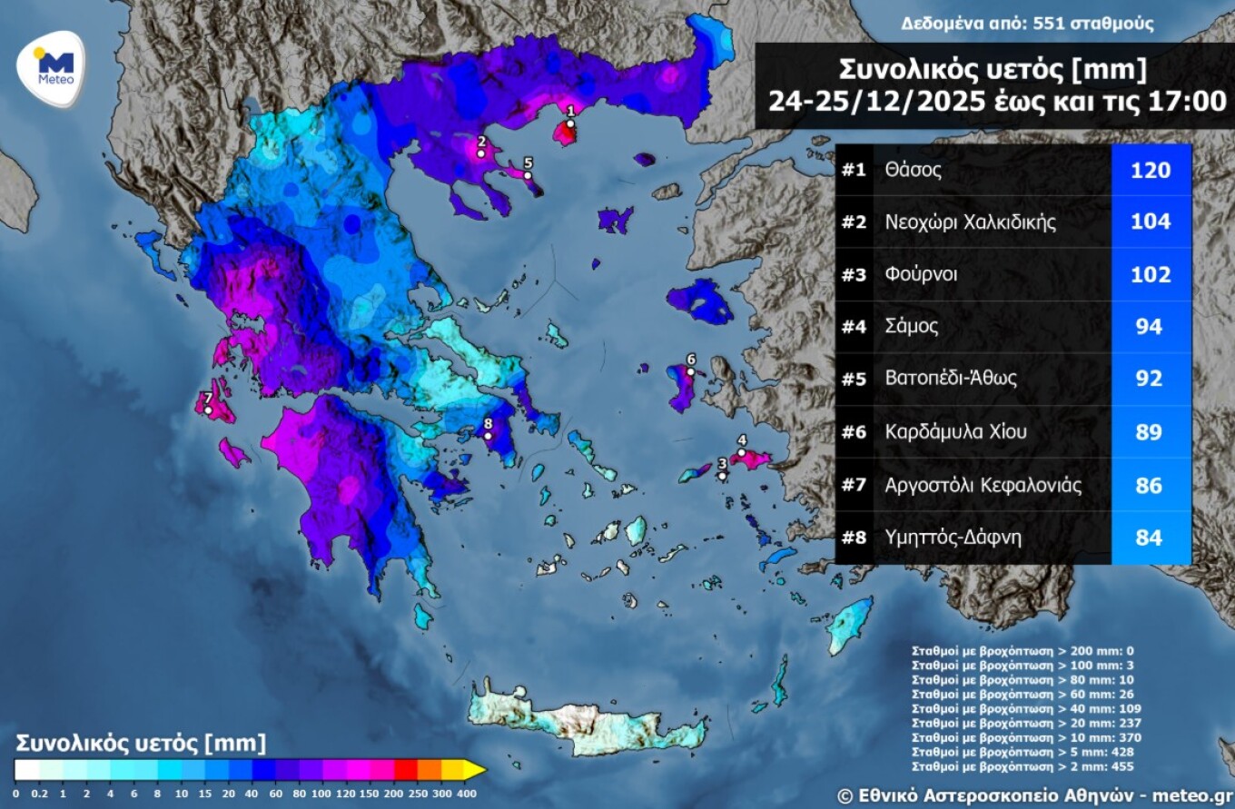 Σύμφωνα με το δίκτυο αυτόματων μετεωρολογικών σταθμών του Εθνικού Αστεροσκοπείου Αθηνών / meteo.gr, το ύψος βροχής στη Θάσο το προαναφερόμενο διήμερο έφτασε τα 120 mm (έως το απόγευμα των Χριστουγέννων), ενώ θα πρέπει να αναφερθεί ότι 109 σταθμοί του δικτύου κατέγραψαν ύψη βροχής > 40 mm*.
