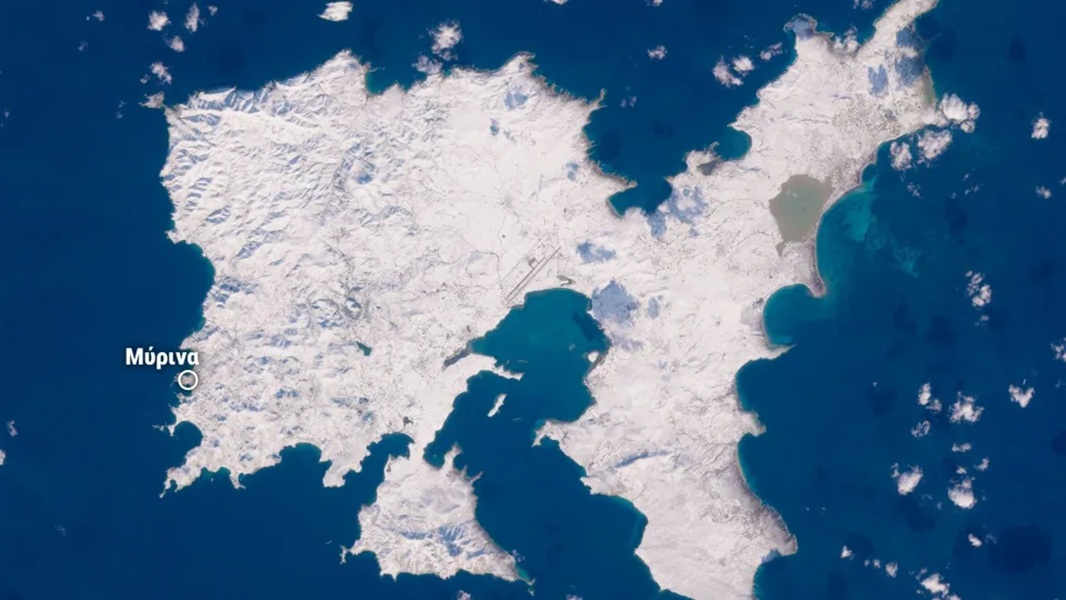 Σκηνές από τον Αρκτικό Κύκλο θυμίζει η παρακάτω δορυφορική εικόνα από το νησί της Λήμνου, που ντύθηκε στα λευκά την Πρωτοχρονιά.