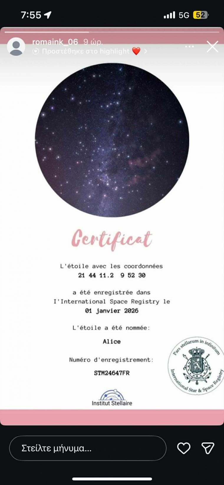 Σύμφωνα με το έγγραφο, αστέρι με συγκεκριμένες αστρονομικές συντεταγμένες καταχωρήθηκε την 1η Ιανουαρίου 2026 και έλαβε το όνομα «Αλίκη».