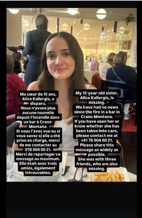 Η 15χρονη Αλίκη Καλλέργη ήταν μεταξύ των 40 ανθρώπων που έχασαν τη ζωή τους κατά τη φωτιά σε μπαρ του Κραν Μοντανά την Πρωτοχρονιά.