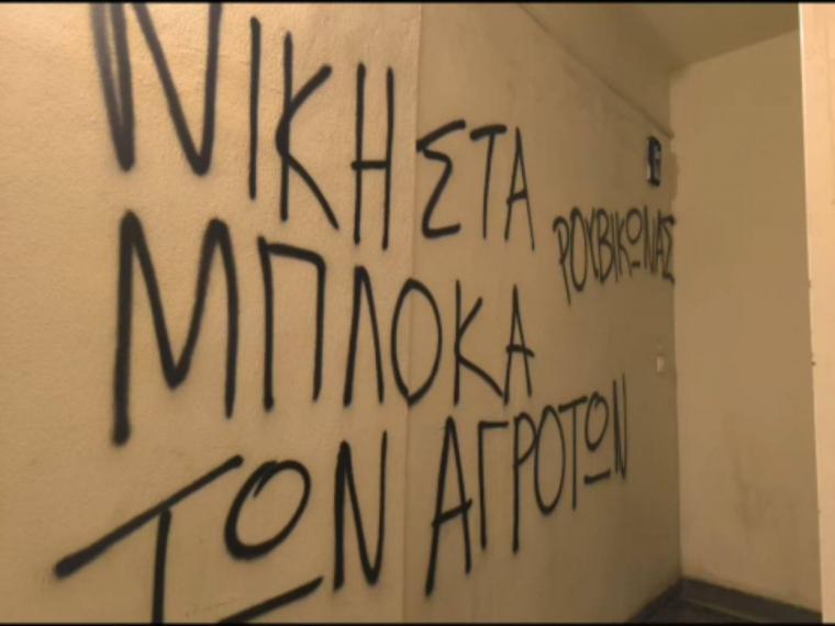 Οι δράστες πέταξαν τρικάκια και έγραψαν συνθήματα στους τοίχους, εκφράζοντας τη συμπαράστασή τους στις αγροτικές κινητοποιήσεις.