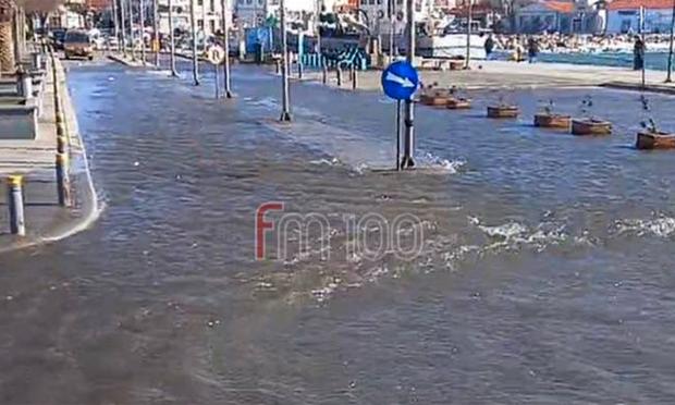 Οι θυελλώδεις νοτιάδες έφεραν τη θάλασσα στο παλιό λιμάνι της Μύρινας στη Λήμνο, με το νερό να καλύπτει τον δρόμο και να φτάνει έως το Δημαρχείο. Το οδόστρωμα και το πάρκινγκ του λιμανιού πλημμύρισαν, μετατρέποντας την περιοχή σε μια ενιαία υδάτινη επιφάνεια, λόγω του έντονου κυματισμού.