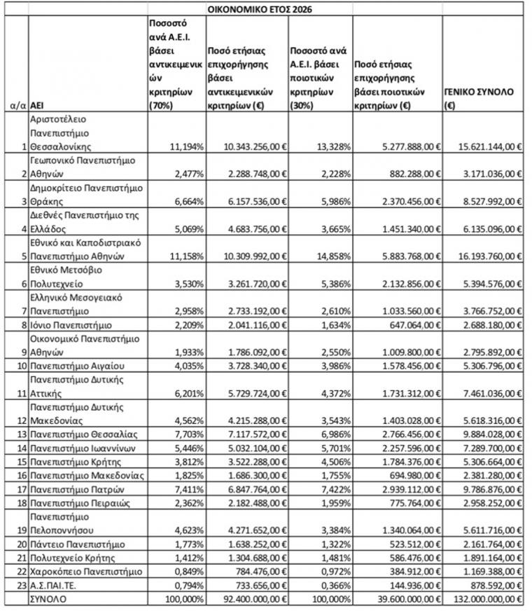 Σύμφωνα με τα αναλυτικά στοιχεία της ετήσιας κρατικής επιχορήγησης προς τα Ανώτατα Εκπαιδευτικά Ιδρύματα της χώρας για το οικονομικό έτος 2026, η συνολική χρηματοδότηση ανέρχεται σε 132.000.000 ευρώ.