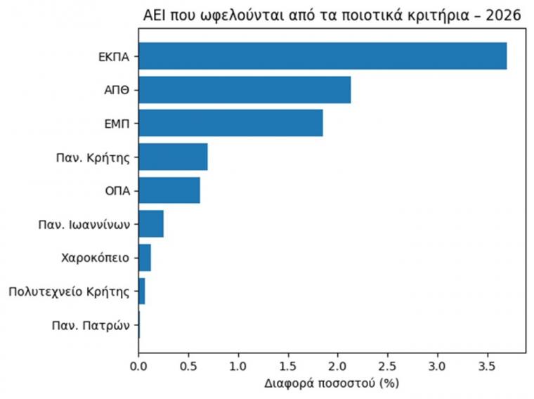 Το γράφημα αποτυπώνει ποια ΑΕΙ ωφελούνται περισσότερο από τα ποιοτικά κριτήρια, δηλαδή σε ποια ιδρύματα το ποσοστό χρηματοδότησης από τα ποιοτικά κριτήρια είναι υψηλότερο από το αντίστοιχο ποσοστό των αντικειμενικών.