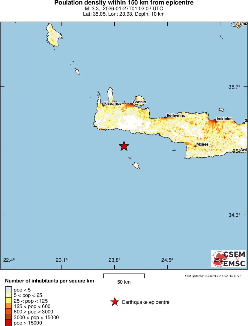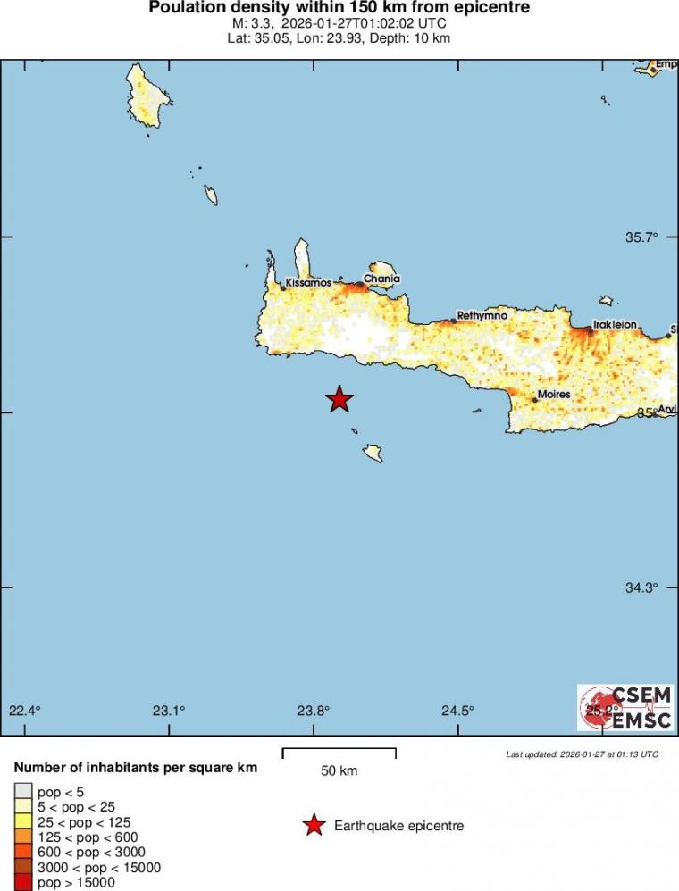 Από την πλευρά του, η αυτόματη λύση του Ευρωπαϊκού - Μεσογειακού Σεισμολογικού Ινστιτούτου (EMSC), δίνει το σεισμό στα 3,3 Ρίχτερ, με εστιακό βάθος τα 10 χλμ., και επίκεντρο τα 30 χλμ. νότια - νοτιοανατολικά της Παλαιόχωρας Χανίων.
