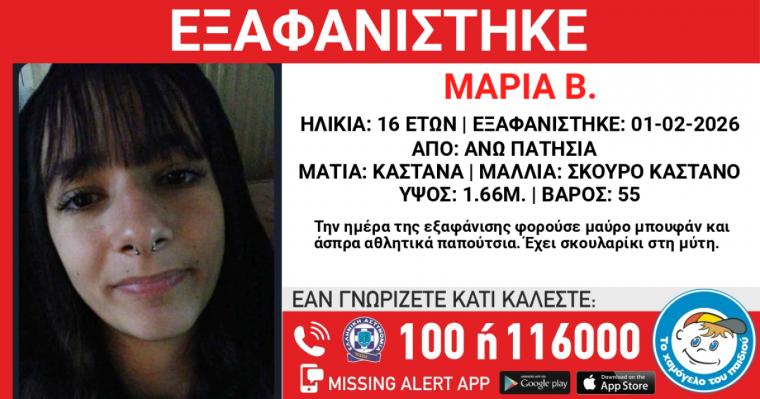 Εξαφανίστηκε 16χρονη από τα Άνω Πατήσια 16χρονη, την 1η Φεβρουαρίου.