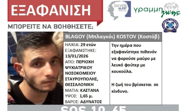 Σύμφωνα με ενημέρωση από τη Γραμμή Ζωής, πρόκειται για τον BLAGOY (Μπλαγκόι) KOSTOV (Κοστόβ), 29 ετών, ο οποίος εξαφανίστηκε στην περιοχή του Ψυχιατρικού Νοσοκομείου Σταυρούπολης Θεσσαλονίκης, το πρωί της 13/01/26.