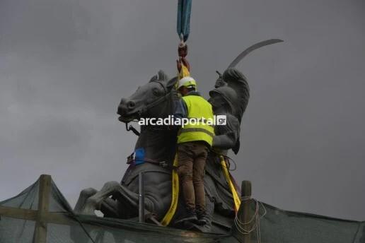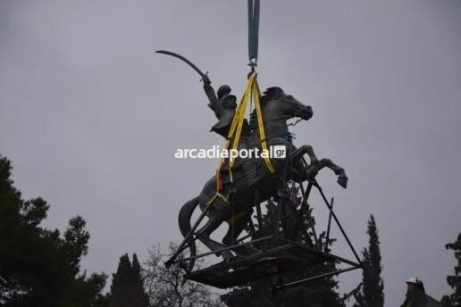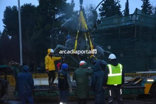 Η απομάκρυνση πραγματοποιήθηκε γύρω στις 6 το απόγευμα της Τετάρτης, υπό έντονη βροχόπτωση. Το ειδικό συνεργείο βρισκόταν επί ημέρες στο σημείο, προκειμένου να διασφαλιστεί ότι η διαδικασία θα γίνει με τη μέγιστη δυνατή προσοχή, χωρίς να προκληθούν νέες φθορές στον ανδριάντα και χωρίς να υπάρξει κίνδυνος ατυχήματος. Πλέον ο ανδριάντας θα βρίσκεται για ειδική συντήρηση σε σχετικά διαμορφωμένο χώρο στη ΒΙΠΕ Τρίπολης. Η συντήρηση αναμένεται να κρατήσει, σύμφωνα με όσα έχουν αναφερθεί, περίπου τρεις μήνες, εκτός και αν βρεθούν περισσότερες ζημιές στον ανδριάντα.