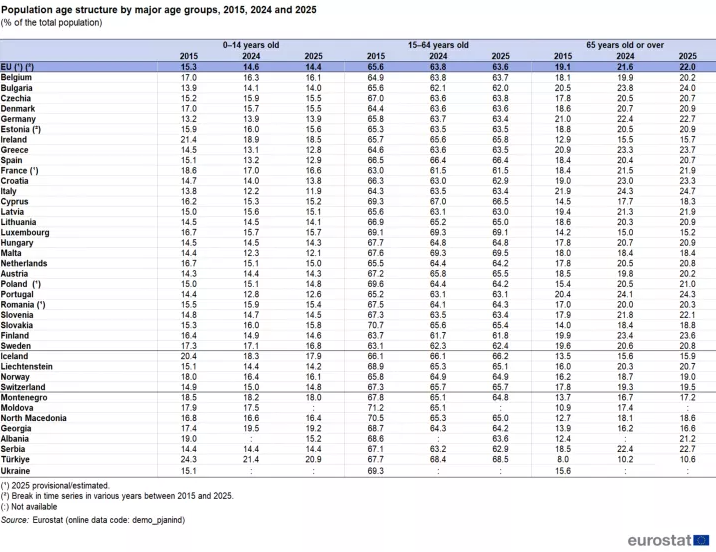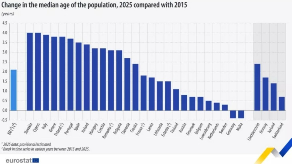 Σε επίπεδο Ευρωπαϊκής Ένωσης, η μέση ηλικία αυξήθηκε κατά 2,1 έτη από το 2015, όταν ήταν 42,8 έτη, με εξαίρεση τη Γερμανία και τη Μάλτα, όπου παρατηρήθηκε μικρή μείωση κατά 0,4 έτη. Η γήρανση του πληθυσμού ήταν ιδιαίτερα έντονη στη Σλοβακία και την Κύπρο (+4,0 έτη), στην Ιταλία (+3,9 έτη), καθώς και στην Ελλάδα και την Πολωνία (+3,8 έτη), ενώ η Πορτογαλία κατέγραψε αύξηση +3,7 έτη.