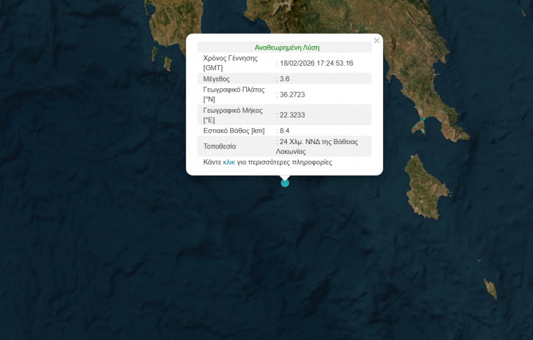 Σεισμός μεγέθους 3,6 βαθμών της κλίμακας Ρίχτερ σημειώθηκε στη Λακωνία αργά το απόγευμα της Τετάρτης (18.08.2026). Στη θάλασσα κοντά στη Βάθεια εντοπίζεται το επίκεντρο της σεισμικής δόνησης.