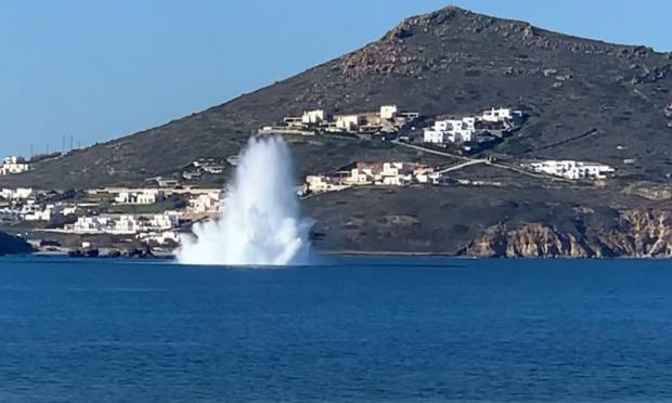 Εντυπωσιακό βίντεο με της ελεγχόμενη έκρηξη της νάρκηςπου εντοπίστηκε σε θαλάσσια περιοχή της Νάξου κάνει τον γύρο του διαδικτύου, καθώς σύμφωνα με το cyclades24.gr, ολοκληρώθηκε χθες το πρωί η επιχείρηση εξουδετέρωσής της.