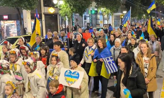 Δεκάδες Ουκρανοί που ζουν και εργάζονται χρόνια στη χώρα μας, μαζί με Έλληνες πολίτες, συμμετείχαν στην κινητοποίηση, ζητώντας να μπει άμεσα τέλος στον πόλεμο.
