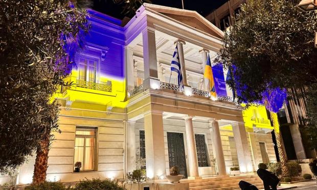 Το ελληνικό υπουργείο Εξωτερικών φώτισε απόψε το κτίριό του στα χρώματα της ουκρανικής σημαίας, καθώς συμπληρώνονται τέταρτη επέτειος της ρωσικής επιθετικότητας κατά της Ουκρανίας.