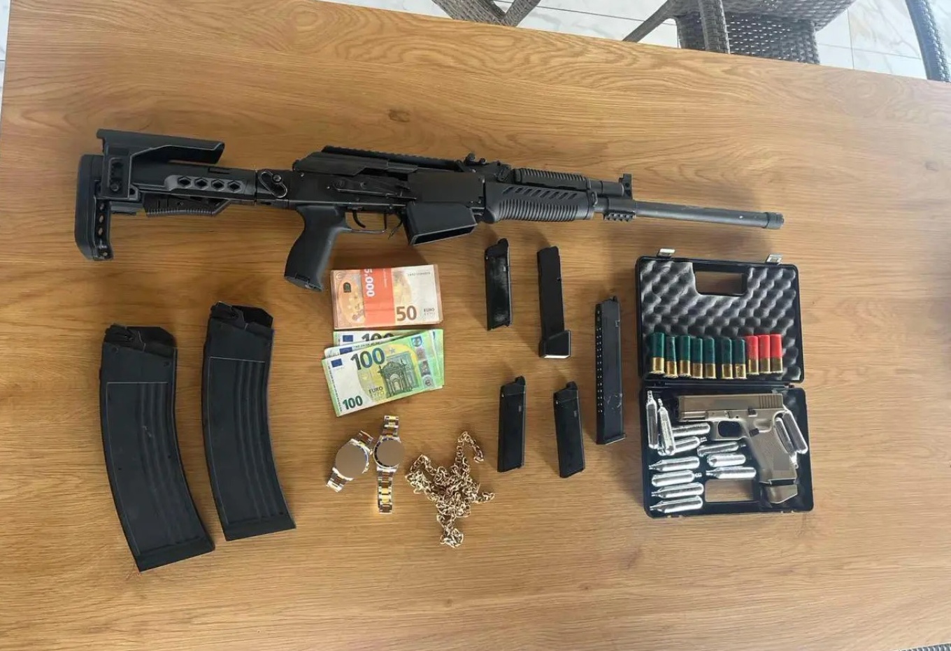 Επιπλέον βρέθηκαν επτά ρολόγια, χρυσές αλυσίδες, δαχτυλίδια, σταυροί, μενταγιόν και τσάντες, ναρκωτικά και αναβολικά χάπια, αμπούλες αναβολικών ουσιών, κάμερες, καταγραφικά, συσκευή γεωεντοπισμού, φορητός υπολογιστής και δώδεκα κινητά τηλέφωνα.
